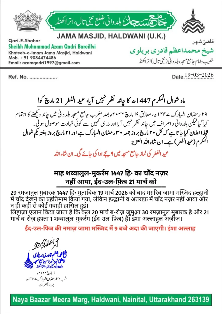 हल्द्वानी: जामा मस्जिद हल्द्वानी की ओर से जारी आधिकारिक एलान के अनुसार माह शव्वाल 1447 हिजरी का चांद 19 मार्च 2026 को नजर नहीं आया। इसके चलते रमजान के 30 रोजे पूरे किए जाएंगे और ईद-उल-फित्र 21 मार्च 2026 (शनिवार) को मनाई जाएगी।