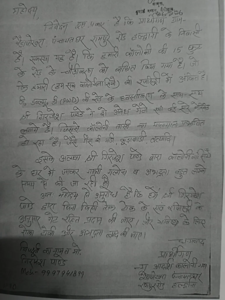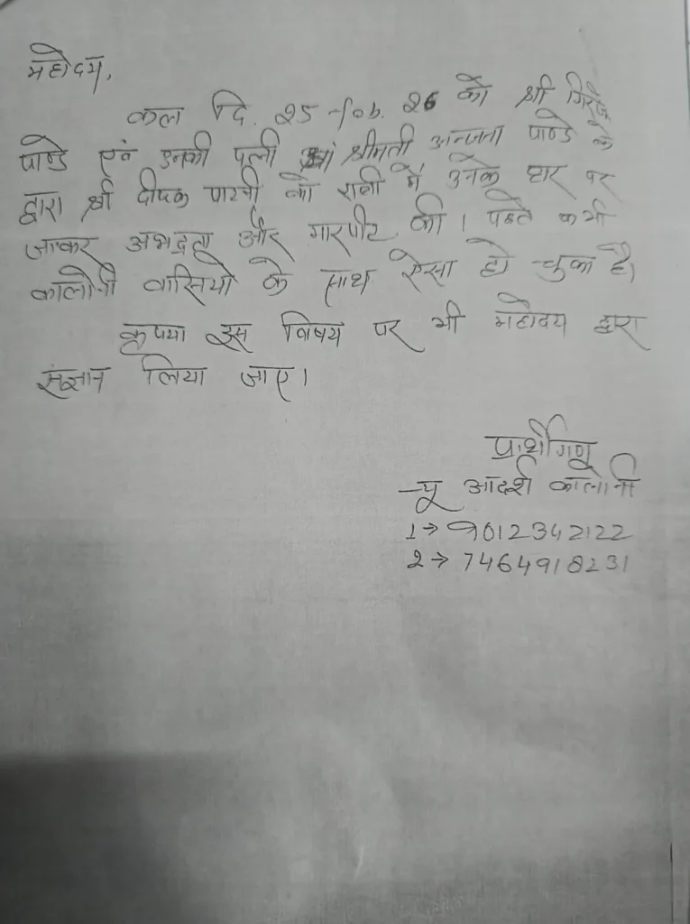 आयुक्त को दी गई लिखित शिकायत में यह भी उल्लेख किया गया कि गिरजेश पांडे और उनकी पत्नी अंजना पांडे द्वारा कॉलोनीवासियों के साथ आएदिन गाली-गलौज, अभद्रता और मारपीट जैसी घटनाएं की जाती रही हैं, जिससे क्षेत्र में भय और तनाव का माहौल बना रहा।