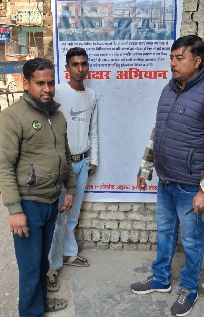 नईबस्ती स्थित एलोपैथिक अस्पताल को 24 घंटे संचालित करने की मांग को लेकर चलाए जा रहे हस्ताक्षर अभियान को क्षेत्रीय जनता का भरपूर समर्थन मिल रहा है। पूर्व पार्षद प्रतिनिधि तौफीक अहमद द्वारा चलाए जा रहे इस जनहित एवं जनस्वास्थ्य से जुड़े अभियान में बड़ी संख्या में लोगों ने हस्ताक्षर कर अपनी सहमति दर्ज कराई।