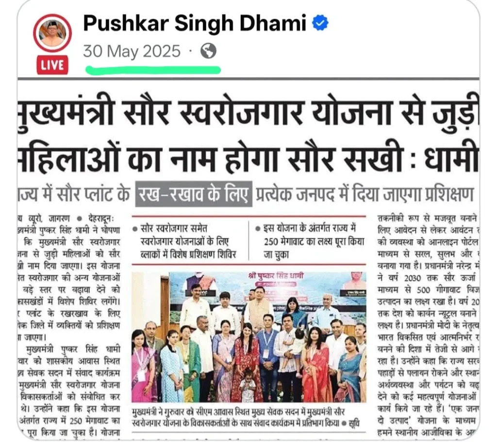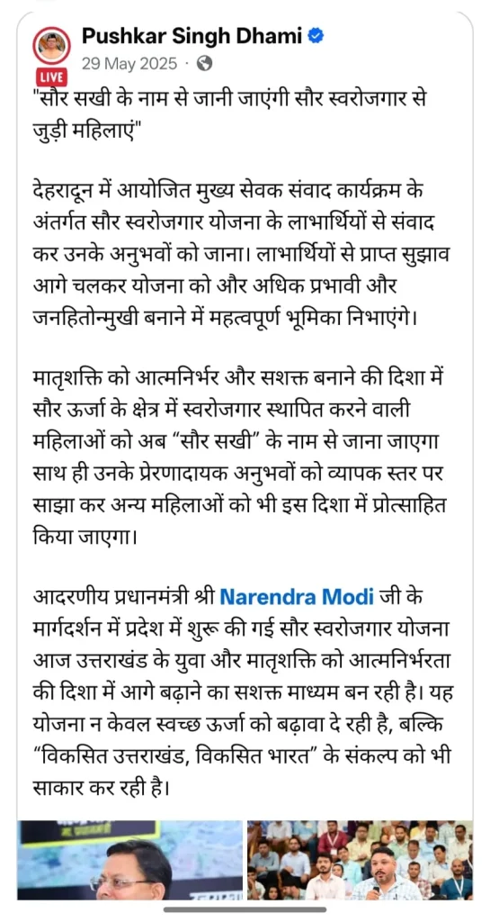 मुख्यमंत्री द्वारा चंपावत दौरे के दौरान इस योजना की घोषणा की गई थी, जिसका उद्देश्य ग्रामीण क्षेत्रों में महिलाओं को सौर ऊर्जा के माध्यम से आय का स्थायी स्रोत उपलब्ध कराना था। इस संबंध में जानकारी मुख्यमंत्री के आधिकारिक फेसबुक पेज पर भी साझा की गई थी। योजना से जुड़ी महिलाओं ने सरकारी घोषणा और प्रशासन के आश्वासन पर भरोसा करते हुए बैंकों से ऋण लेकर सोलर प्लांट स्थापित किए।
